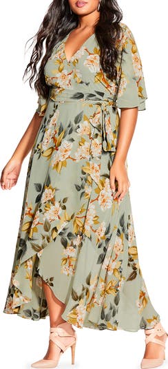 Classic and enchanting, this tie-waist maxi is designed in romantic blooms with a wrapped bodice and fluttering elbow-length sleeves.