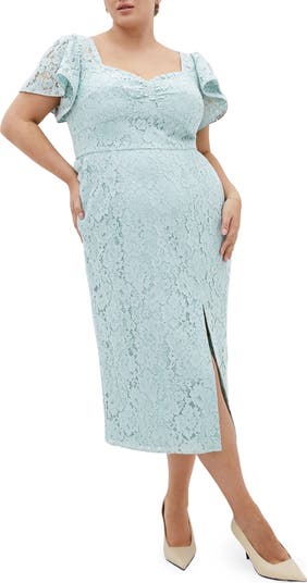 Channel timeless romance in this lace midi dress with a sculpted sweetheart neckline and flutter sleeves that add a soft touch to its curve-skimming silhouette.
