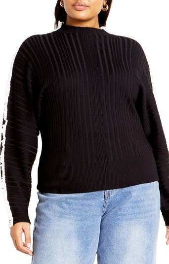Sporty stripes dash down the shoulders and sleeves of this modern, lightweight sweater that is articulated by variegated ribbing.