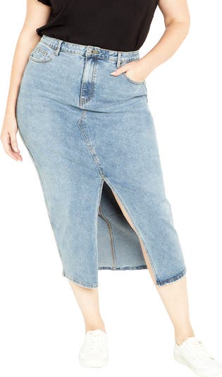A front slit lends easy movement to this high-waist denim midi skirt designed with just a hint of stretch.