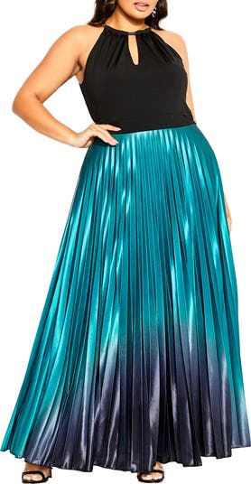 Snake-chain hardware and a keyhole cutout bring visual interest to the halter neckline of a fit-and-flare dress fashioned with a pleated ombré skirt.