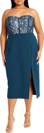 A lacy bodice with supportive boning gives way to a smooth skirt in this strapless dress that will get glasses raised.