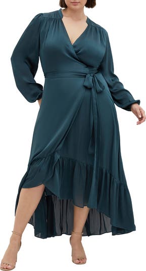 A ruffled high/low hem gives graceful movement to this glossy satin maxi designed in a wrapped silhouette for a figure-skimming fit.