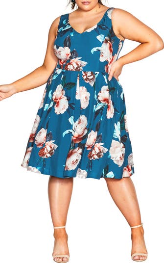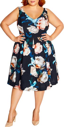 A bountiful floral pattern decorates a romantic date-night dress fashioned in a classic A-line silhouette.