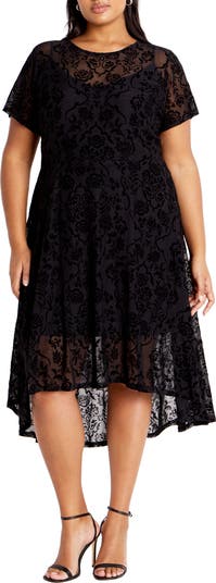 A high-low hemline adds to the graceful flow of a night out dress textured in plush blooms and cut from airy mesh.