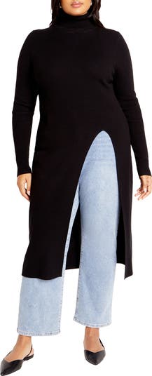 A longline silhouette gives layerable versatility to this curve-hugging sweater-dress that has a soaring slit along the hem.