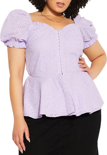 Eyelet embroidery adds subtle texture to a peplum top complete with puff sleeves and a sweetheart neckline.