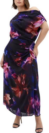 Oversized, photorealistic blooms tumble across a deeply charming one-shoulder maxi dress that's ready to captivate the party crowd.