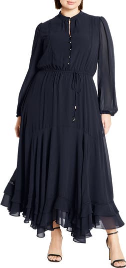 Chiffon sleeves and an asymmetric hemline amplify the modern elegance of this occasion-ready maxi dress.