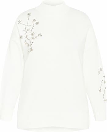 A soft and breathable mock-neck sweater is knit in a longline silhouette and adorned with lustrous rhinestones for a luxe look and feel.