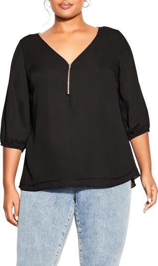 An exposed zip runs all the way up the V-neckline to add a dash of industrial edge to an otherwise classic three-quarter-sleeve blouse.