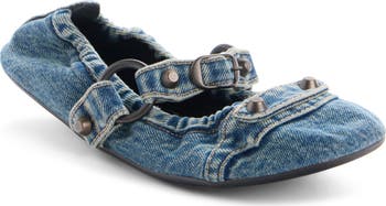 Signature studs punctuate the scrunched silhouette of a denim flat that's lined with luxe leather and secured with a buckled strap.