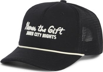 Vibrant 3D logo embroidery marks the front of this rope-accented trucker hat finished with an adjustable snapback strap.