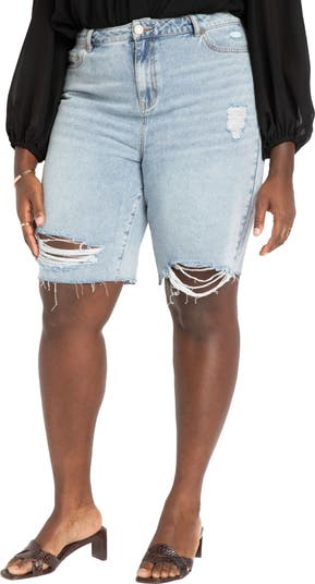 These high-rise Bermuda denim shorts combine frayed hems and distressing details for a casual-cool vibe in a comfortable, medium-weight stretch denim.