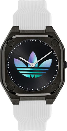 Strap/closure: Silicone strap with adjustable buckle closure.