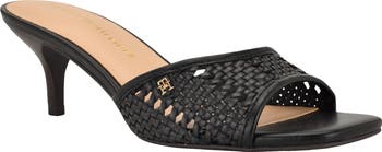 Subtle logo hardware highlights the intricately woven upper on a minimalist faux-leather sandal featuring a tapered kitten heel for a stylish hint of height.