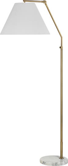 This slim, modern floor lamp has a satin finish and is topped with a crisp linen shade, creating an understated touch to any room. The adjustable-height design of this piece is ideal to set near a sofa or desk..
