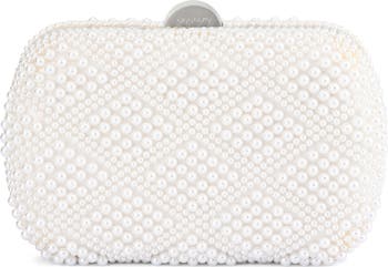 Polished logo hardware and glossy faux pearls underscore the elegant appeal of a structured frame clutch suspended from an optional chain strap for hands-free wear.