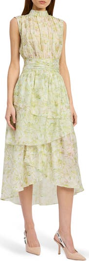 This linen‑kissed high‑low dress features a graceful mock neck and a confidence-inducing Empire waist that defines the silhouette with timeless elegance.