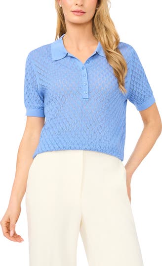 An openwork knit brings airy texture to this short-sleeve polo finished with a clean button half placket and structured point collar.