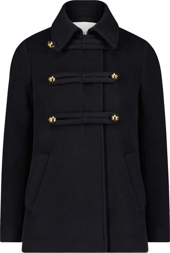 The Clara pea-coat is double breasted with clean lines and relaxed fit made in a mid-weight, double face melton fabric with a soft brushed surface. Dropped shoulder line, deep armhole and wide sleeves for comfort and easy layering. The body is straight and has a relaxed silhouette. Gold dome metal buttons for front closure. FREE SHIPPING AND DUTIES PAID IN THE USA AND EUROPE (EU).