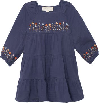 The Clara Dress from Mabel and Honey is a picture of timeless style and thoughtful design, perfect for girls' everyday adventures or special moments. Its navy blue fabric showcases a beautifully multi-tiered silhouette, creating a flowing, ruffled effect that?s both playful and elegant. The delicate embroidered floral patterns on the chest and sleeve cuffs, bring a burst of color to the dress, making it a head-turner for any occasion. Fabric Content & Care 100% COTTON Machine Wash Cold | Line Dry | Do Not Bleach