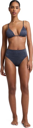 Offered in shimmery or ribbed swim fabric, our Clara bikini bottom is detailed with a high-rise waist, an elongating high cut at the leg, and moderate back coverage.