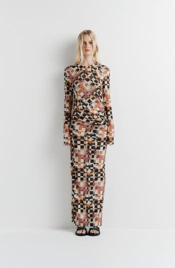 The Clara Mesh Dress is a Romy staple, now updated with new details. Featuring single-side gathering to contour the waist, a back split for ease of movement, and bell sleeves. Still double-layered through the body for that signature sculpted feel, and finished with a classic crew neckline. Artwork in collaboration with Phoebe Willis.