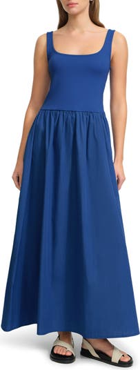 A full cotton-poplin skirt popped with pockets brings lovely dimension to an A-line dress designed with a fitted European-ponte bodice.