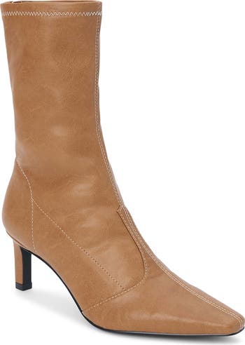 A low heel and streamlined profile with a sock-like fit make this faux-leather boot a modern essential that's easy to pair with just about anything. Contrast topstitching highlights the blunted, elongated toe, while a back zip makes it a breeze it take on and off.