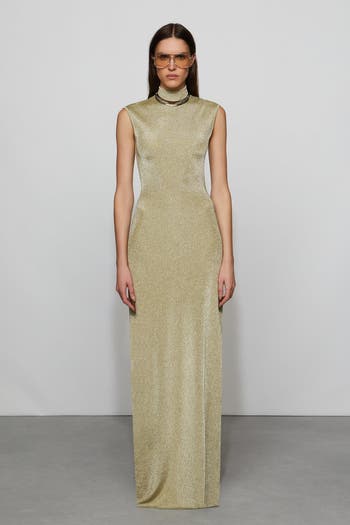 Shimmery heavyweight knit column gown with a soft brushed interior. Designed with sculpted shoulders and a circular back cutout. Packs light—maximum glow, zero fuss.