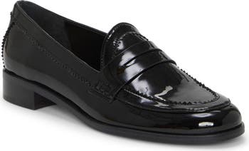 Delicately serrated trims bring subtle dimension to a streamlined penny loafer shaped from rich leather and set on a low, stacked heel.