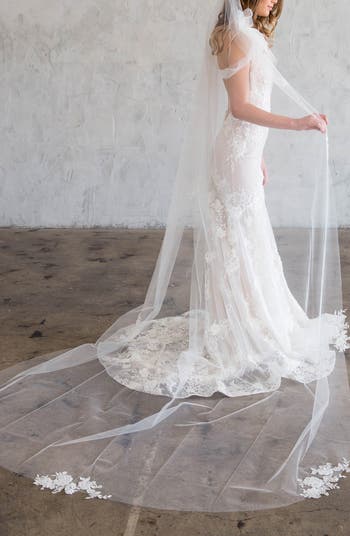 This beautiful cathedral-length veil is handmade from a single layer of soft Spanish tulle edged in guipure lace appliqués.