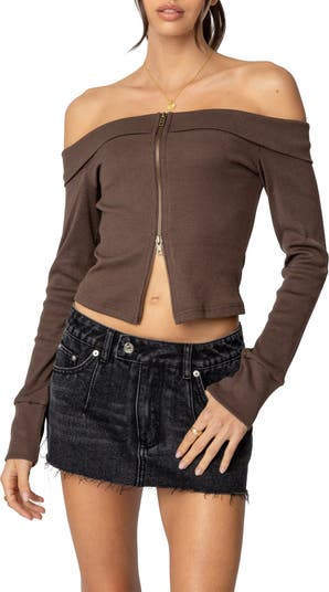A flashy zipper highlights the midriff-baring design of a ribbed top complete with an off-the-shoulder neckline.