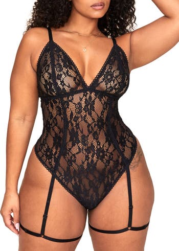 Our sheer, curve-hugging floral-lace bodysuit comes with dramatic adjustable garters and a lace-up back feature that are made to be seen.