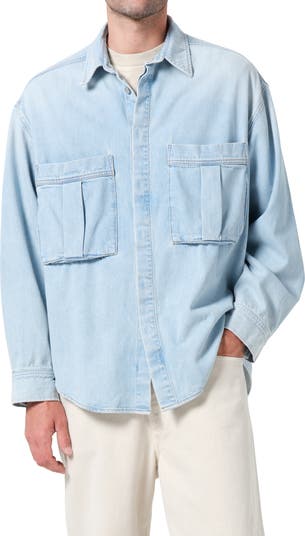 Faded denim brings workwear character to this button-up shirt jacket made from regenerative cotton and cut in relaxed silhouette with oversized patch pockets.