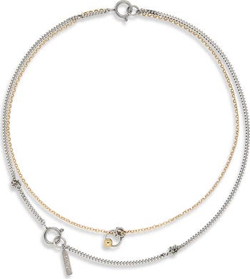 Inspired by glam rock and hardware-heavy punk influences, this statement necklace is handcrafted with layered 24-karat-gold-dipped and palladium-dipped chains pierced with signature hardware and a crystal-embellished mini ring.
