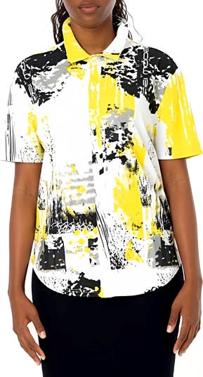Color takes the lead on this short-sleeve button-up splashed with a bold abstract print that turns heads. Soft, stretchy jersey keeps it comfortable, while the curved hem adds a clean finish.