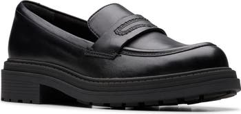 High shine patent leather defines a timeless loafer set on a low block heel and finished with a grippy lugged sole for traction and support.