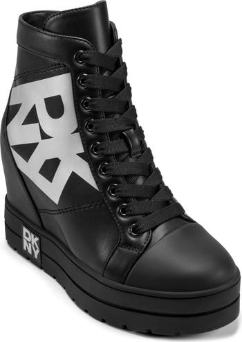 Logo details amplify the street-chic style of this lace-up sneaker set on a lofty wedge heel.