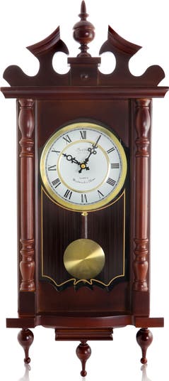 Bedford Clock Collection offers you the elegance and beauty of classic style with the modern reliable technology of today's wall clocks. Whether a gift to your self or for someone else, this clock will add a special touch of sophistication to any room. With its stunning Cherry Oak finish, Golden Accents and Swinging Pendulum, this wall mountable time piece is not only an attractive focal point, but a functional and reliable piece of technology. With 4 distinct Chimes, the clock will announce the beginning of each new hour for your convenience. Carved details and special touches through out , as well as a convenient Sleep Mode that provides you with the option to pause the melodic chimes of this beautiful time piece for an entire 12 hour period with a simple push of your finger. Item Dimensions: 31.00" x 12.00" x 5.00" Item Weight: 11.00lbs