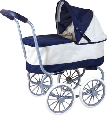 CLASSIC DOLL PRAM: NAVY & WHITE - This traditional Lissi-style navy and white carriage pram is the ultimate transportation for little ones who love to take their dolls or plush friends for a stroll in timeless style. Elegantly designed with vintage-inspired details, this classic pram captures the charm of old-fashioned baby carriages, making it a beautiful addition to any playtime collection. The removable carrycot allows for easy transport to friends’ houses or family visits, so your little one’s favorite doll can always travel in comfort. The adjustable navy canopy and removable apron add a realistic touch, protecting dolls from “rainy days” during imaginative outdoor play. Large 7.5" wheels and a sturdy frame provide smooth rolling and stability, while the 27" handle height is perfectly sized for young caregivers. This pram not only encourages nurturing role-play but also inspires storytelling, sharing, and emotional development as children care for their dolls just like real parents. A beautiful way to create lasting memories, this elegant navy and white pram will delight children and adults alike. Suitable for ages 3 and up.