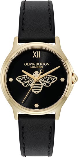 A goldtone-on-black design highlights the delicate wing structure of the brand's signature classic bee centering the minimally detailed dial of this simply elegant watch with a black calfskin-leather strap.