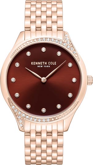 Glittering pavé crystals bring unparalleled glamour to the bezel and burgundy dial of this quartz-powered timepiece boasting a classic bracelet strap.