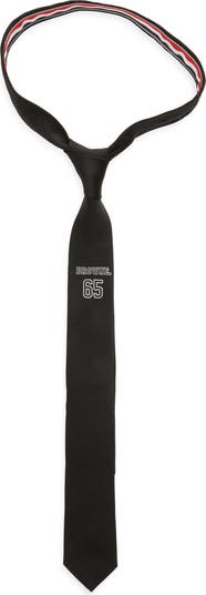 Ace your style game off the court with this Italian-silk tie that teams the visual language of sports jerseys with typical house codes like tricolor stripes and a four-bar name tag at the back.