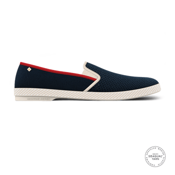 Moccasin in Cotton Canvas and Seaqual* Mesh Features: Cotton canvas and Seaqual* mesh Gold-plated metal rivet Cotton bias Ease elastics Removable leather insole Saddle-stitch cotton band around sole PVC sole Made in Spain Composition: Upper: 100% polyester mesh Insole: 100% cork Outsole: 100% PVC