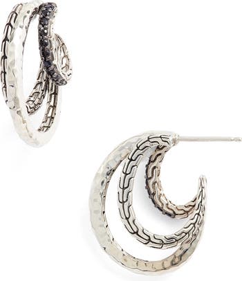 These handcrafted sterling silver hoop earrings that add polished texture to any look feature sparkling gemstones, hammered details and a carved chain motif.
