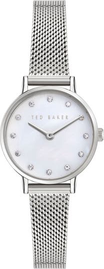 Sparkling crystals shine brightly as the hour markers on this polished watch charmed with a luminous mother-of-pearl dial and coordinating mesh bracelet.