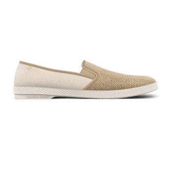 Cotton Canvas and Raffia Textured fabric with raffia effect and cotton canvas Canvas lining and terry cloth lining Gold-tone metal rivet Grosgrain ribbon trim Comfort elastics Removable leather insole Cotton band around the sole PVC sole Made in Spain Note: If slightly snug, the material will stretch. If between sizes, we recommend going with the larger size. Composition: Upper: 100% polyethylene Quarters: cotton canvas Upper lining: 100% cotton canvas Quarter lining: 100% organic cotton terry cloth Insole: 30% lambskin leather, 40% carbon latex, 30% cork Outsole: 100% PVC Rivieras is committed to more responsible fashion. As part of our traceability project in partnership with Crystal Chain, we share full transparency on the sourcing and manufacturing of our garments. To learn more, scan the QR code on the label inside the garment.