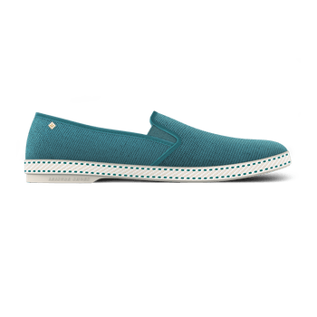 Cotton canvas moccasin . Cotton canvas . Ecru terry lining . Gold-plated metal rivet . Cotton bias . Ease elastics . Removable leather insole . Saddle-stitch cotton band around sole . PVC sole Note: Since the canvas is lined, it does not stretch too much. If in doubt, choose one size larger. Made in Spain Composition . Upper: 70% recycled cotton 30% viscose canvas . Lining: 100% organic cotton terrycloth . Insole: 30% lambskin 40% carbon latex 30% cork . Outsole: 100% PVC Rivieras is committed to more responsible fashion. As part of our traceability project carried out in partnership with Crystal chain, we reveal the origin and manufacturing details of our garments. To find out more, scan the QR code on the label inside the garment.